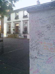 The studio seen with a small part of the wall laden with handwritten greetings to the Beatles and each member of the band.