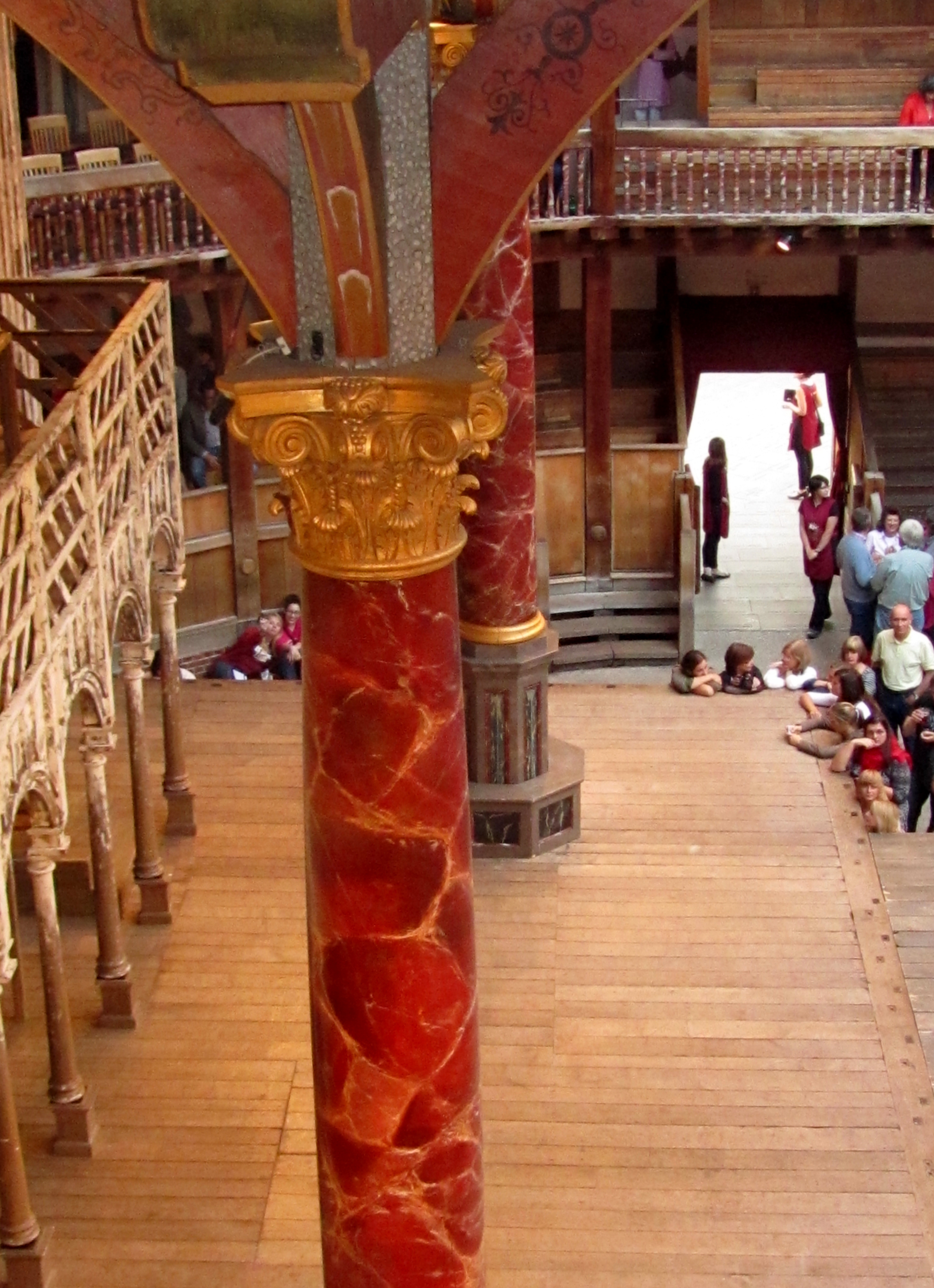 Prior to the performance we join a “setting the scene” lecture by Professor Sandra Clark of the University of London. She is not a riveting speaker, but we still learn a good deal about the play, known as a farce, and the current perspectives of critics and scholars. Two actors from the company are present and give impressive, suitably Shakespearean readings, which everyone enjoys. I ponder whether this was the best play to choose for our first experience at the Globe… a sexist, misogynist, unpleasant story, she says. Most critics today don’t like it, given that it’s about “unruly” wives being disciplined by husbands. Dr. Clark gives an honest portrayal of the dark side of the play, such as starvation and brainwashing, but also helpfully offers up some contrasting thoughts about how the main characters, Petruchio and Katherina, both rise through pain to transformation. Later I decide that whatever pain Petruchio experiences, Katherina, his reluctant new wife, definitely gets the worst of the deal. We troop off down flights of stairs and across cobblestones to the theatre.