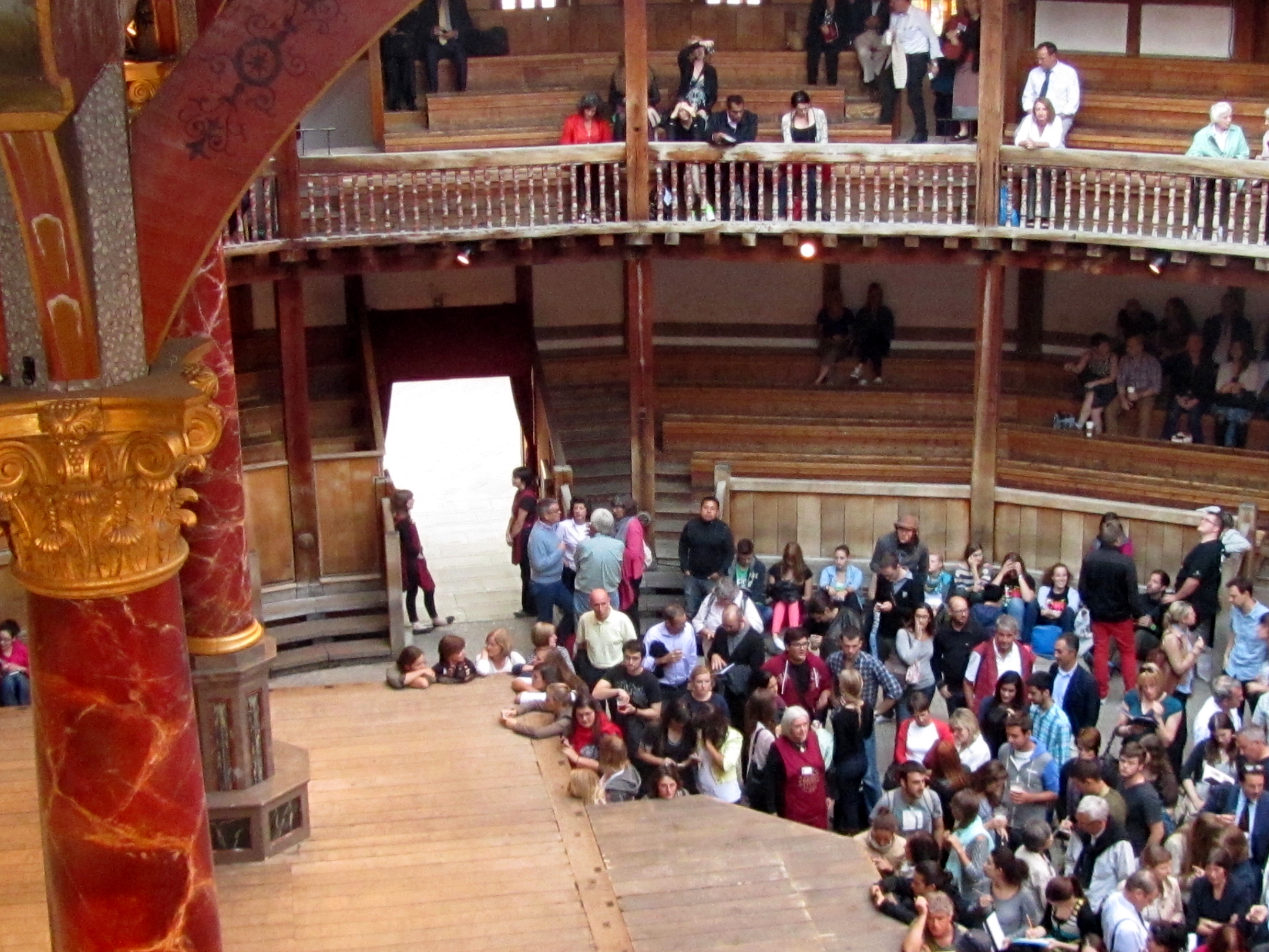 When we arrive at our seats, we come to understand just how faithfully its reconstruction followed Elizabethan architecture. The benches were built for the smaller people of that time and, even though we rent cushions, they are truly uncomfortable. My better half has a difficult time fitting his six-foot, sturdy frame into the allotted space. (More on this later.) We look around and see that, like much of London, the crowds of people surrounding us are mostly young, animated and far more limber. (More on nimble audiences in a moment.) We look down and see that a large space in front of the stage is open for the audience to stand, many leaning on the stage as the play begins. The actors flow onto the stage, but also suddenly appear in the standing audience, which is a big hit.
