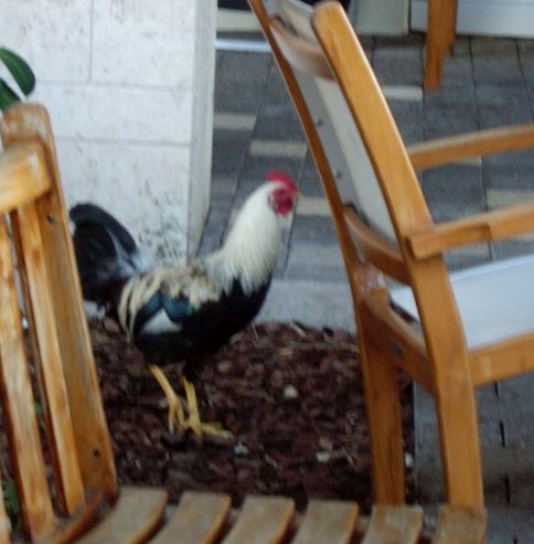 This morning I took a bag of trash to the dumpster. On the way, Simon said “Be careful – there’s a rooster living in the dumpster and he gets annoyed when you throw garbage on his head.” Oh ha, ha, I thought – a rooster in the dumpster – sure, sure. So I chuckled all the way over there. As I lifted the bag to toss it in, a large and energetic-looking rooster emerged from the depths of the bin and gave me a filthy stare. He leapt onto the top of the trash with a grumbling “BAWK!” and for a moment I thought I was going to do morning battle with this feathery protector of all that has been tossed. And I knew who would win … not me. Best of luck, he did a good impression of a roadrunner, dashing across the trash and away into the bushes.