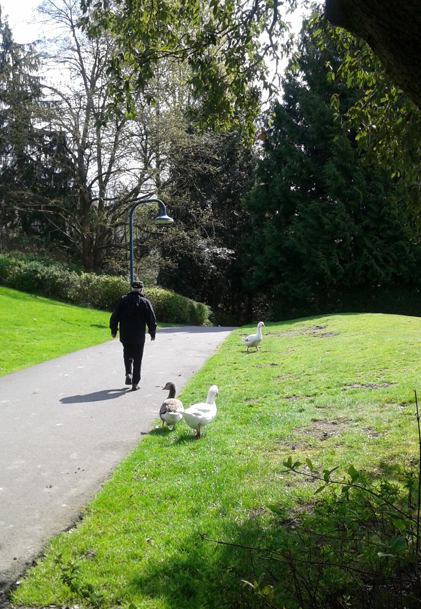 At the park, I admire remnants of an old pier marching alongside a new one. Then a small gaggle of domestic geese, trying out the spot usually occupied by Canada geese, taking a walk on the wild side.