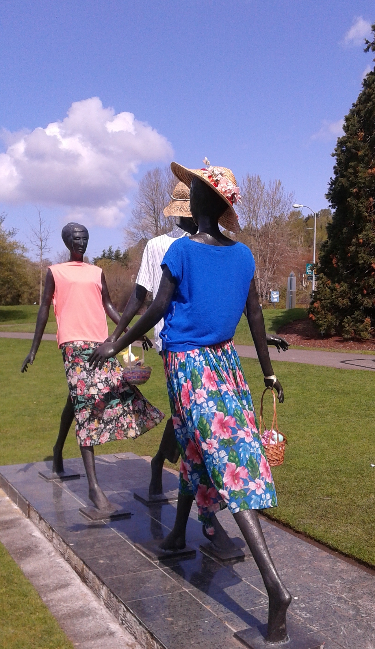 There’s a sculpture of walkers at the entrance to the park and now and again, someone dresses them for the seasons. Now they are kitted out in Easter bonnets, or so it appears to me.